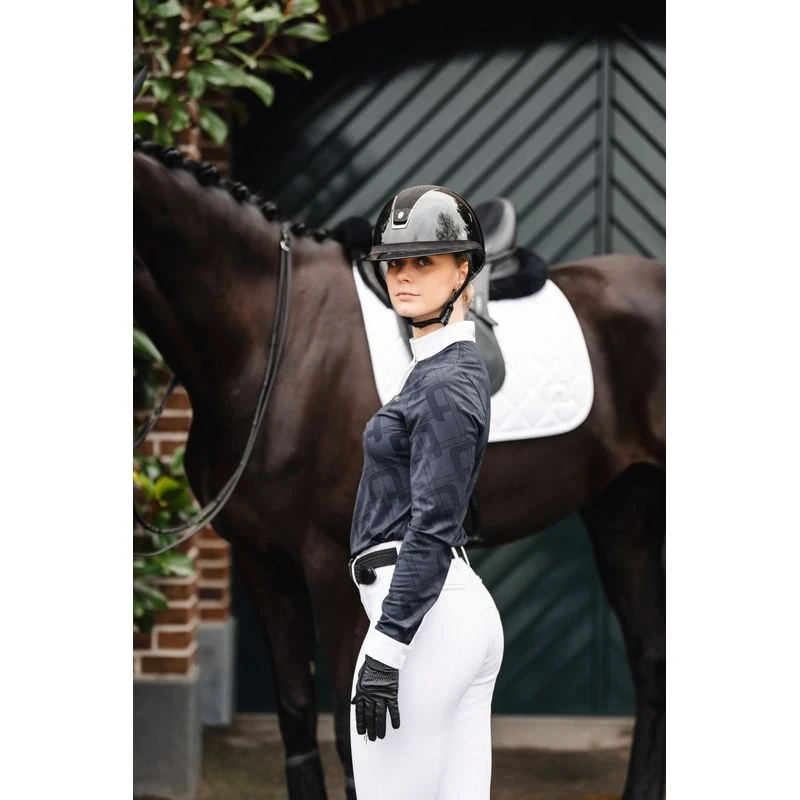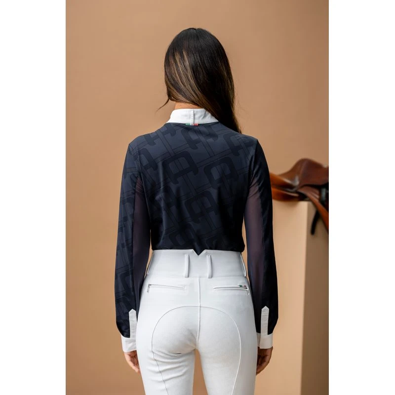This shirt is made in a technical and functional four way stretch fabric with soft hand feel and all over tone on tone monogram. It has a concealed zipper white placket and stand up white collar with magnetic closure. The cuffs are also white. It is extremely breathable, with mesh inserts under the arms. UPF 50+