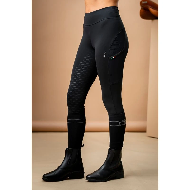 These premium tights are made in a durable high performance nylon fabric. They are high rise and flattering seam lines for optimum shape retention. A silicon full seat provides extra grip and stability in the saddle. Sleek thigh mesh panels ensure optimum air flow. The inner leg is seam free for comfort. The lower leg is perforated to stay cool under tall boots.