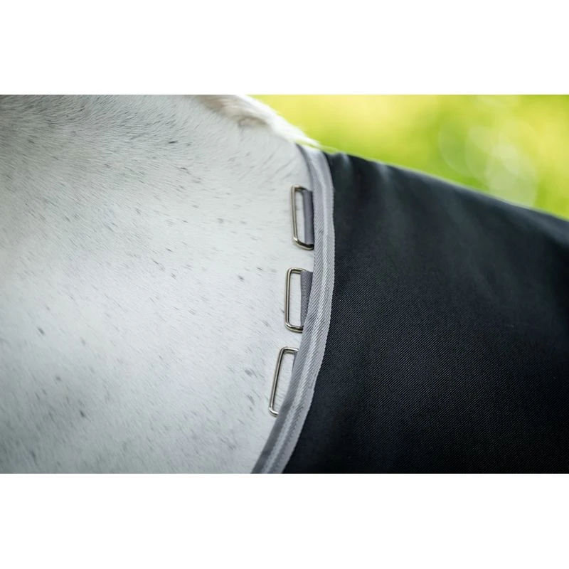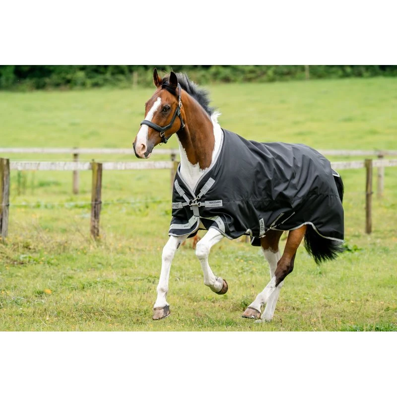 This turnout has a super tough, waterproof yet breathable 1200D outer, and a super smooth complete inner liner. It features Horseware leg arches and a V-front closure for comfortable fit. It has three crossed web surcingles and PVC wipe clean tail cord. It is liner, hood, and leg strap compatible (straps, hood and liners sold separately).