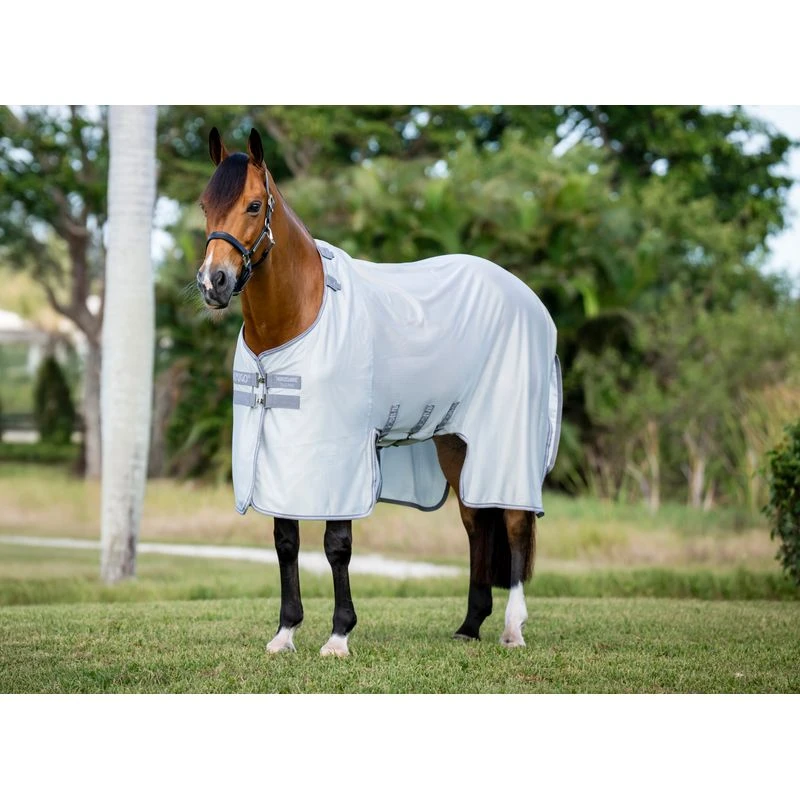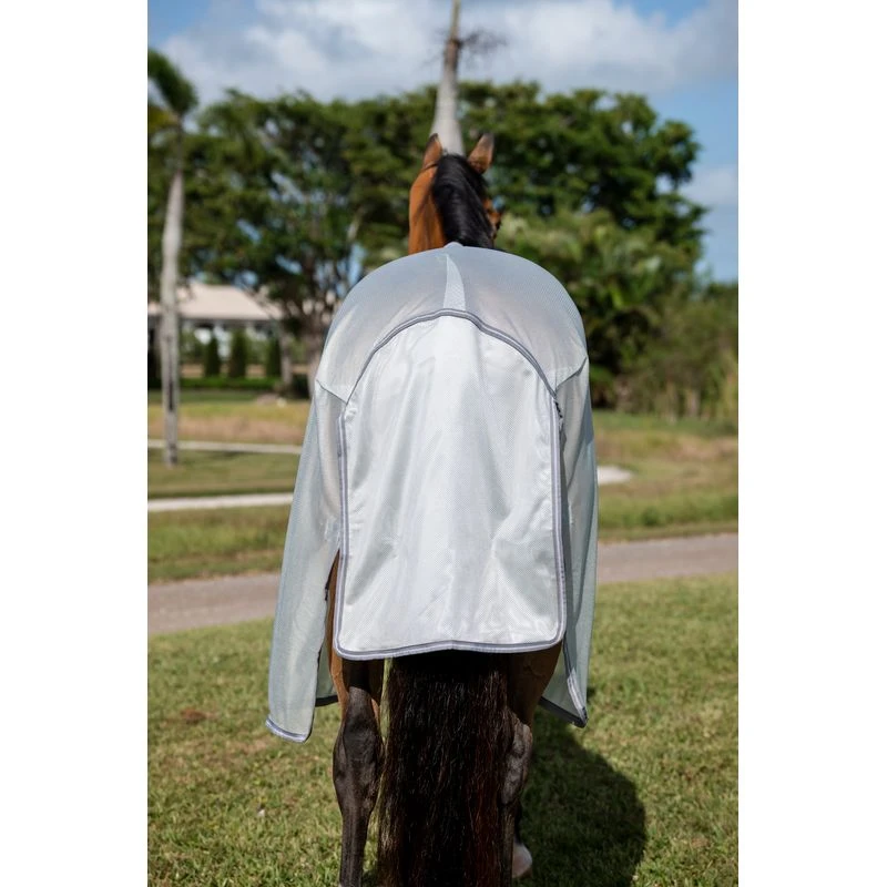 This fly sheet is made with a strong lightweight 100% polyester mesh. It has three straight surcingles that keep a the belly wrap in place (and the fiies out). The sheet is cut extra long to knees and hocks; the extra coverage combined with the movement keeps flies off the legs. The straight front T lock closure is easy to use. An extra long tail flap covers the back end.