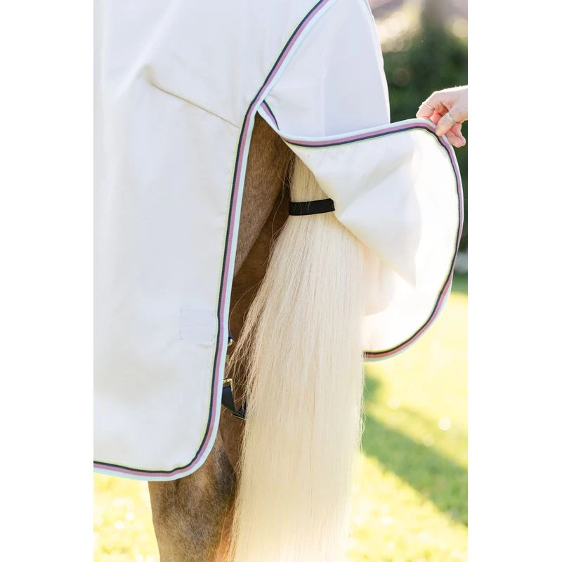 Made of 600D close woven ripstop polyester, this sheet covers all over from ears to tail and full belly wrap. The neck is integrated and not removable. The three staight surcingles with flap create maximum coverage, while leg arches allow for freedom of movement. The close woven fabric offers 90-95% UV protection.
