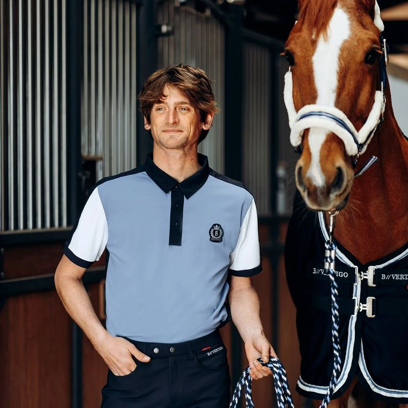 Our B Vertigo Alec polo shirt is made from breathable piqu fabric that feels soft and cooling on the skin. The contrasting colors look unique, but the classic combinations will easily fit into your riding wardrobe. Short sleeves and button closure prevent you from overheating. Wear this polo shirt riding, in the stables or in your free time for a cool look. Also available in women’s cut (#33591).