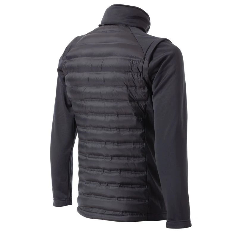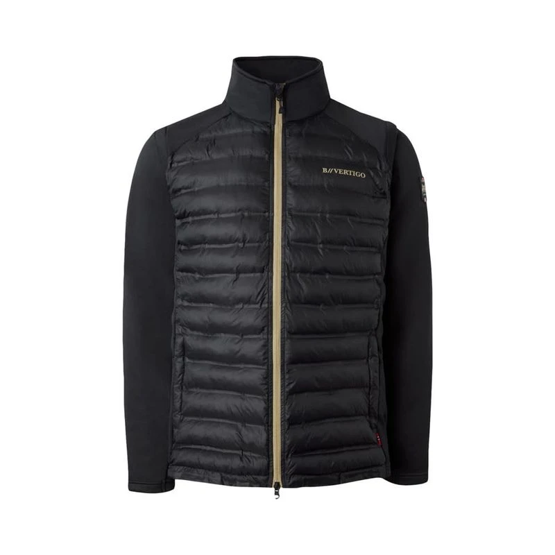 Hybrid jacket with a laser quilted (without normal stitchings) body part. For increased wearability the sleeves of this style are removable so you can also wear this as a vest. The two-way zip and delicate B Vertigo logo on the left chest are in beige color, creating a timeless classy look. Two front zip pocktets to keep your belongings safe.