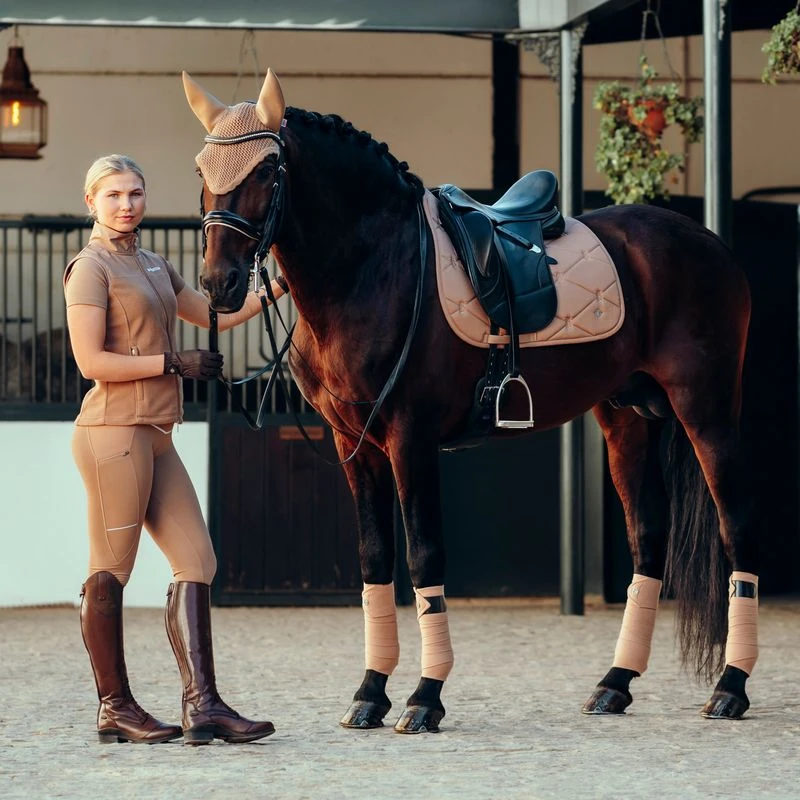 Our B Vertigo Adara riding tights are equipped with a super stylish high waist with elastic ribbed sides for extra comfort. The breathable fabric feels great on your skin without you having to worry about overheating. Zipper thigh pockets keep your phone safe and in reach at all times. Contrasting stitching adds to their stunning shape. Pair them with the matching B Vertigo Adara shirt for a full active outfit.