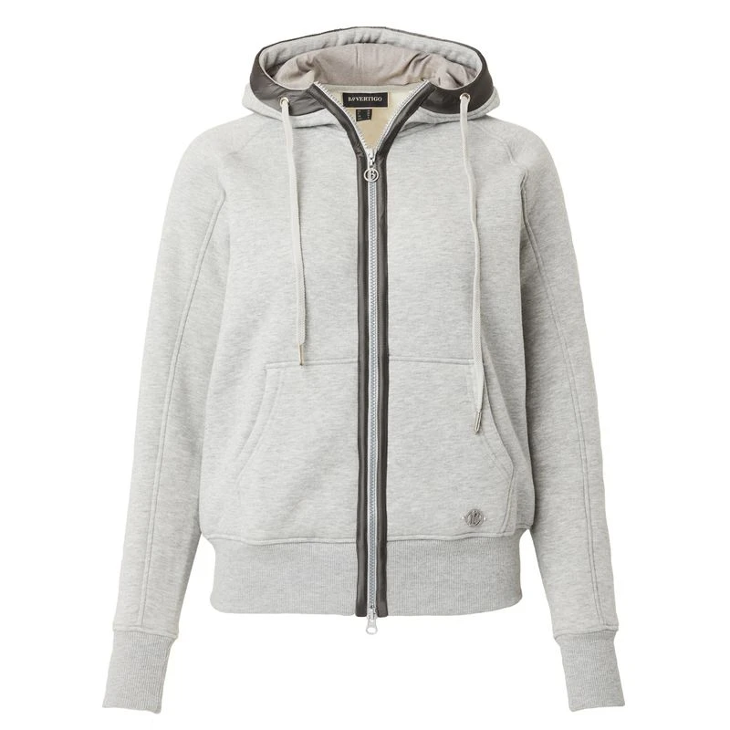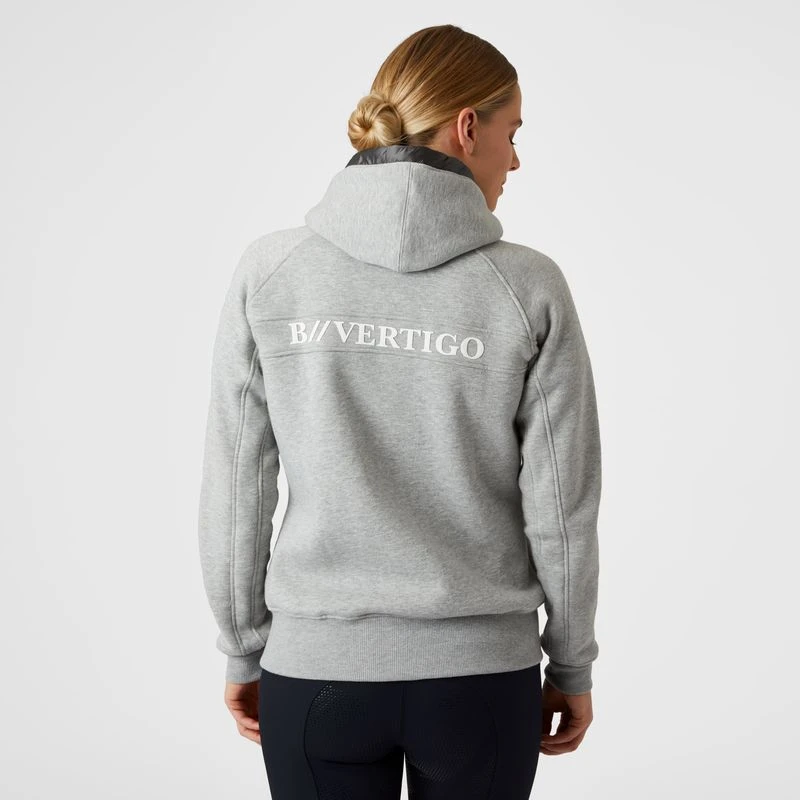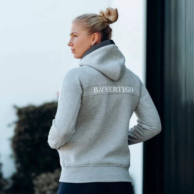 The B Vertigo Gianna Zipper Hoodie is super comfortable for riding. Soft, elastic material with brushed inside keeps you warm when you need it, and is easy to throw on over your favorite shirt. The adjustable hood and ribbed cuffs add extra warmth and keep the wind away. Shiny fabric around hood and zipper is an eye-catching detail. The big back print looks cool and adds sporty vibes. Pair this hoodie with your favorite breeches, riding tights or jeans.