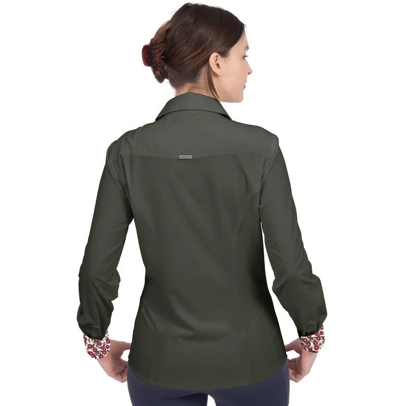 Made of a lightweight 2-way stretch cotton blend fabric offering superior performance and comfortable fit. A mesh lined back yoke adds cooling airflow. Beautiful Liberty fabric prints on the inside collar band and cuffs add a touch of fun and sophistication. Key features include a hidden low profile YKK zipper along a no-show snap placket for a smooth gape-free front. Hidden snaps at the collar and cuffs, a traditional banded shirt collar, shirttail hem and princess seam tailoring make this shirt a rider classic. The subtle Western touches make this a great option as street fashion too!