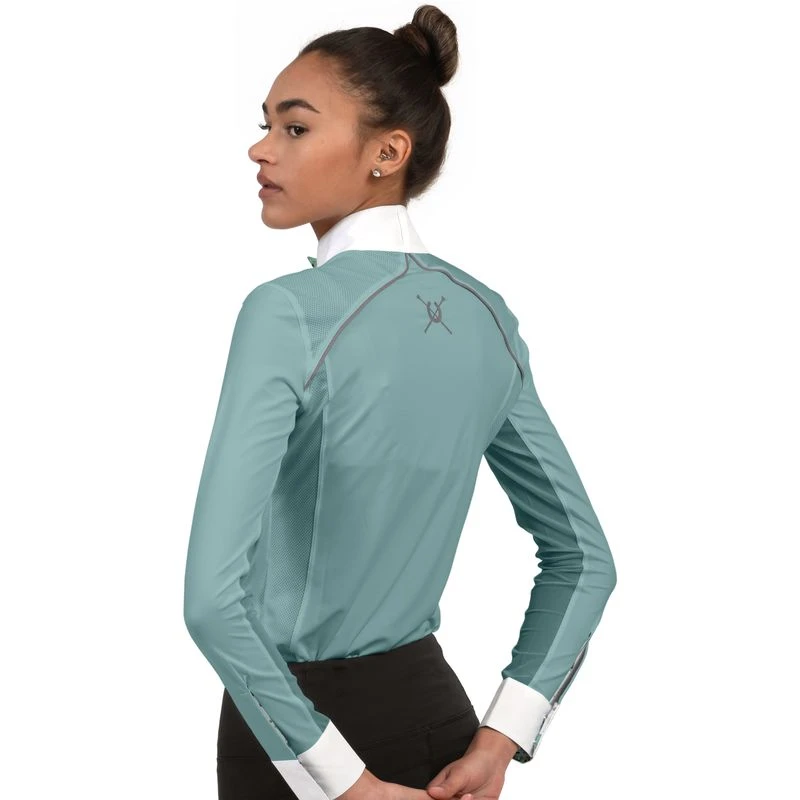 The trademarked SkyCool technology, proven to help the body manage its core temperature, keeps you comfortably cool and dry in warm, humid weather conditions, ideal for your next competition. SkyCool technology is infused in the fabric that works for the life of the shirt and never washes out. Blending classic style with superior performance features, the pull-over style long sleeve show shirt has perfectly placed mesh panels for immediate cooling, an inventive bib design that prevents gaping, and hidden snap collar and cuffs featuring patterns that show off your street to stable side when worn casually.