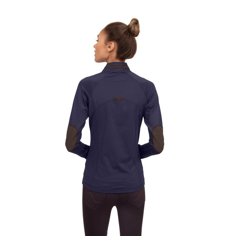 This cool weather tech shirt has slimming and semi-fitted panels that contour the curves of the body for a flattering style. A hi-low length for modest coverage without bunching, beautiful contrast YKK zipper with an inspired bit zipper pull, left side pocket holds a cell phone securely, and thumbholes to keep your sleeve down and hands warm. Suede trimmed stand-up collar that zips down for cooling down apres ride. Suede elbow patches add an classic equestrian charm.