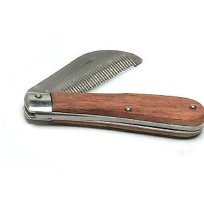 Classic stripping comb that folds into its wooden handle. Durable stainless steel will hold up to repetitive use. Size: 4-inch-long handle with 3-inch blade.