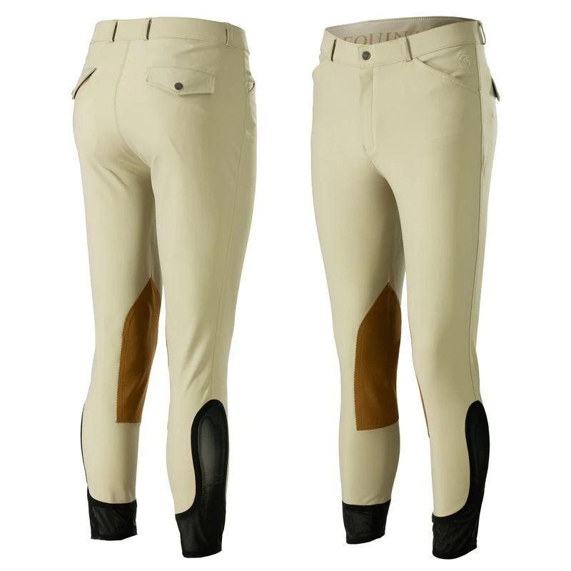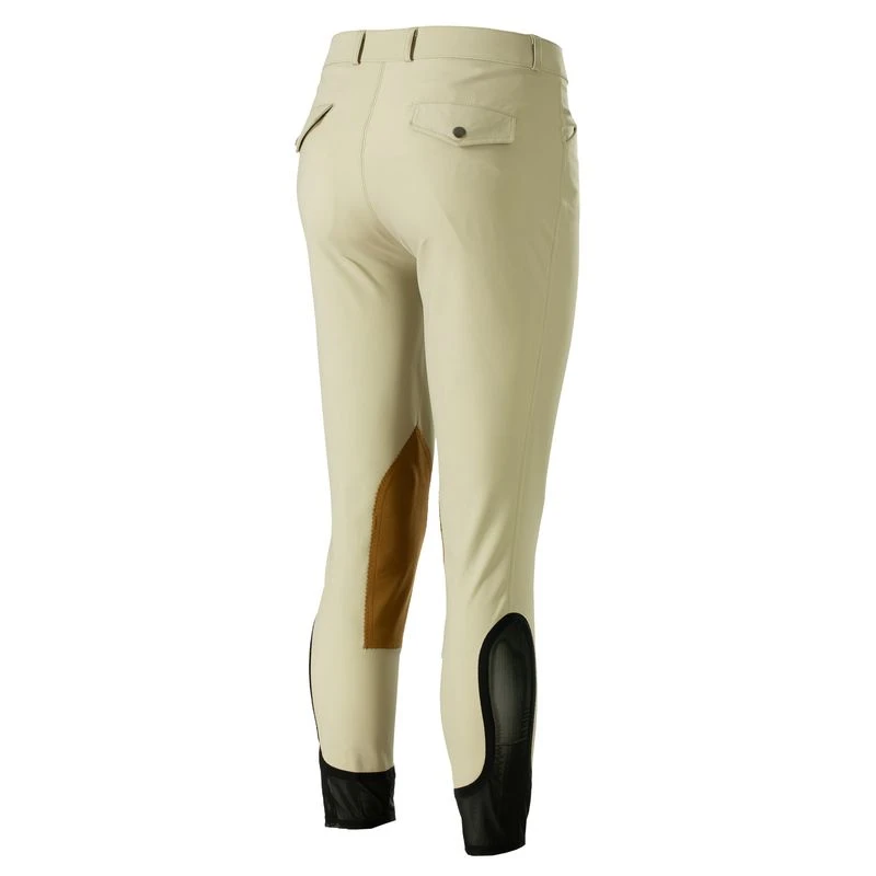 This version features a chestnut colored faux suede knee patch grip in a traditional show tan. The fabric is high quality technical fabric with a lot ot strech from the spandex and moisture wicking features. The fabric is ideal for 3 season wear and very confortable and coolling on warm days. This breech has a front zip with flat front, gutos hook slide closure with internal reinforcement so only fabric touches and there is no metal to pinch the skin. It has two front slash pockets and two back pockets. It has silicone grip inside the waist to keep shirt neatly tucked in. Duarable and stretchy micromesh sock bottoms are added for minimal boot bulk.