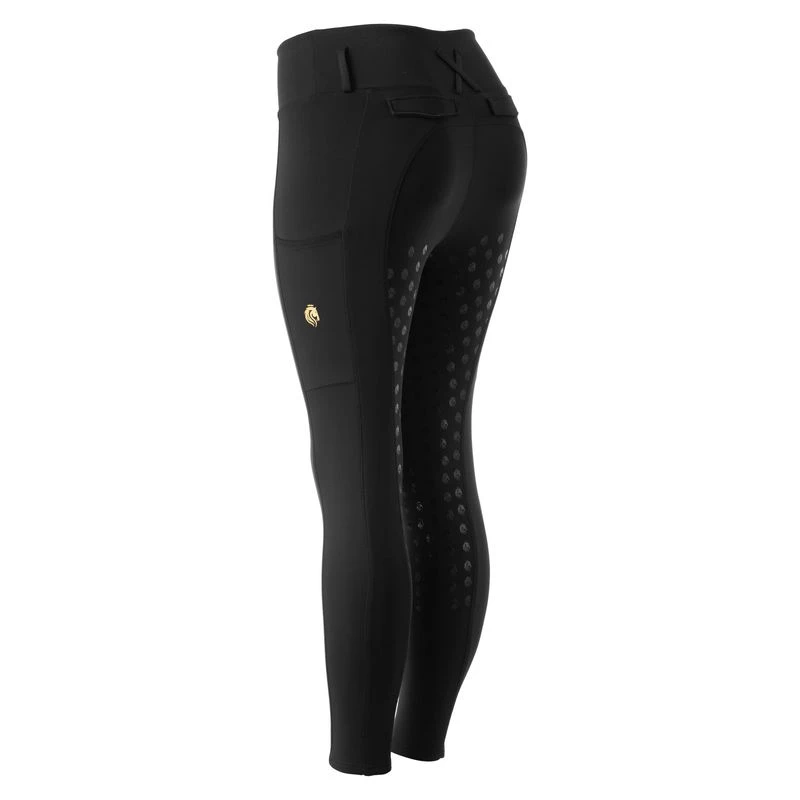 These modern tights have the performance of a breech with the comfort of a tight. The modified high rise is slightly higher in the back than the front, with a trendy wide waistband. It has just enough stretch for comfort and enough compression to look good. The extended patch seat gives you more stick than knee patch, but not the bulk of a full seat.