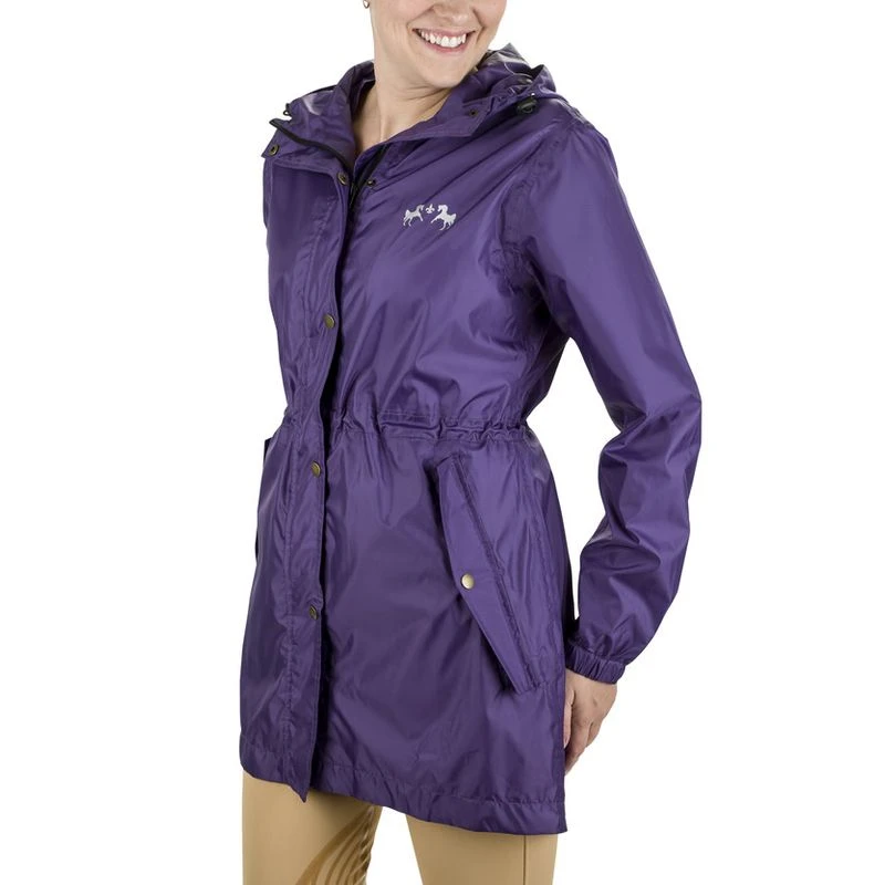 Waterproof breathable and wind-blocking this classic three-quarter length jacket features lightweight fabric. A zipper paired with metal snaps allow for maximum coverage to block out unwanted weather. An adjustable elastic hood seals out the wind and rain to keep you dry while you ride or do barn work Achieve that fitted look with an adjustable elastic waist. Convertible split coat tails make sure you don’t sit on your jacket and keep contact with the saddle. Extra large pockets will easily hold a smartphone extra gloves and treats!