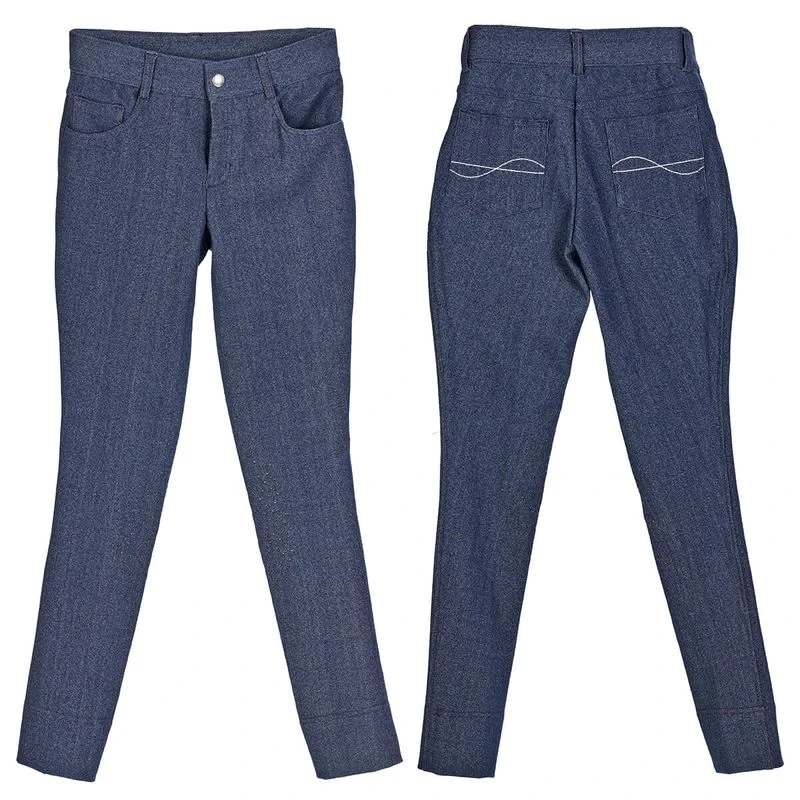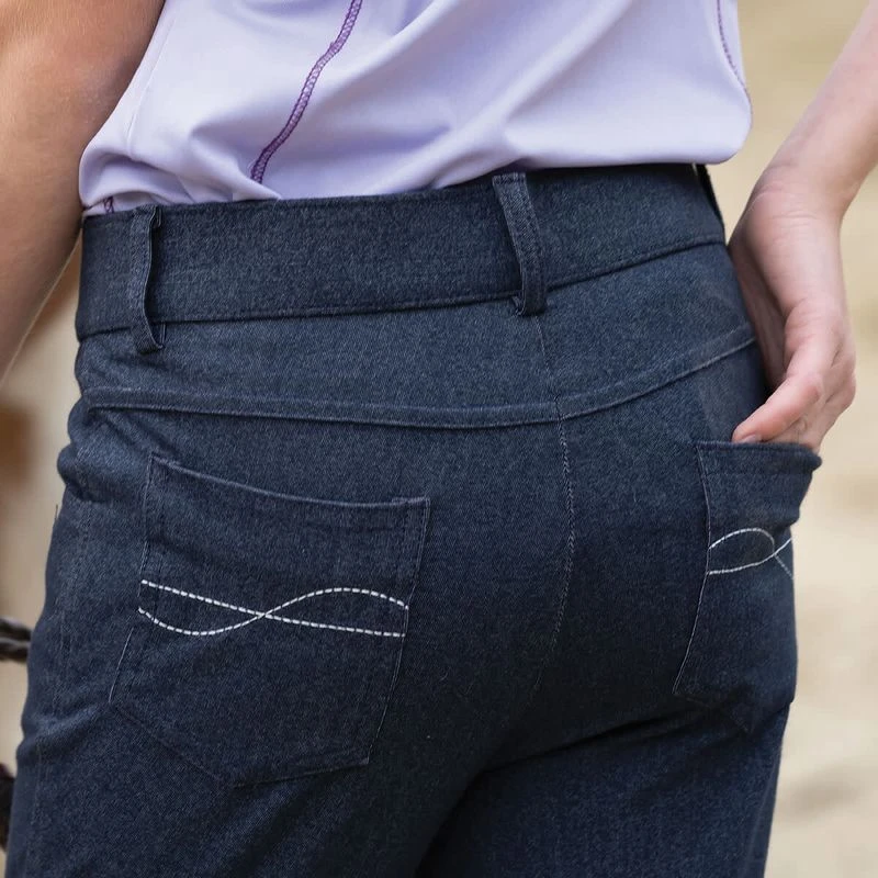 Made in a durable four way stretch knit performance breech fabric with the look of traditional jeans. The smooth seams are chafe free, and fun star pattern non-slip silicon knee patches add grip in the saddle.