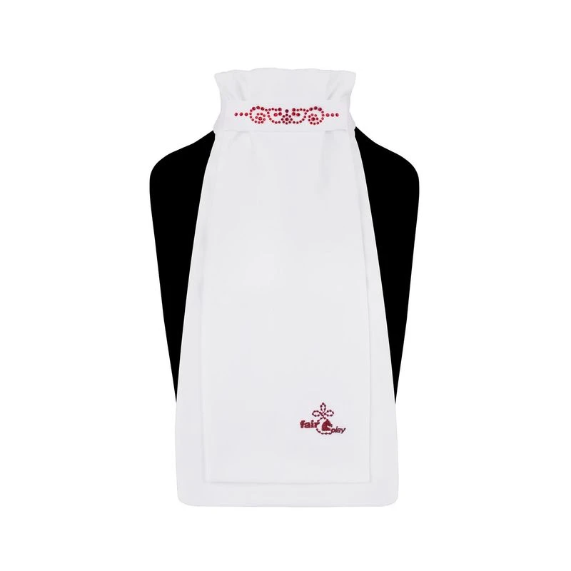 This stock tie is made of white taffeta with contrast embroidery and jets. It is pre-tied with easy to use touch and close fastener at the back.