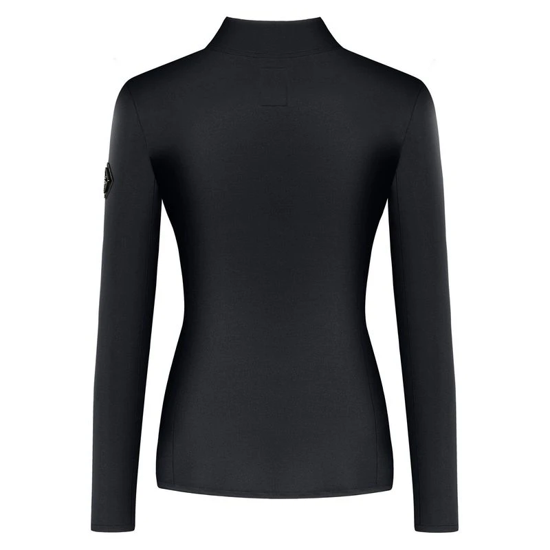 This two way stretch light jacket has a stand up collar and traditional track suit look. It has a feminine, close fitting shape and two way zipper for ease in the saddle. There are two spacious zip pockets and a metal Fair Play logo on the sleeve.
