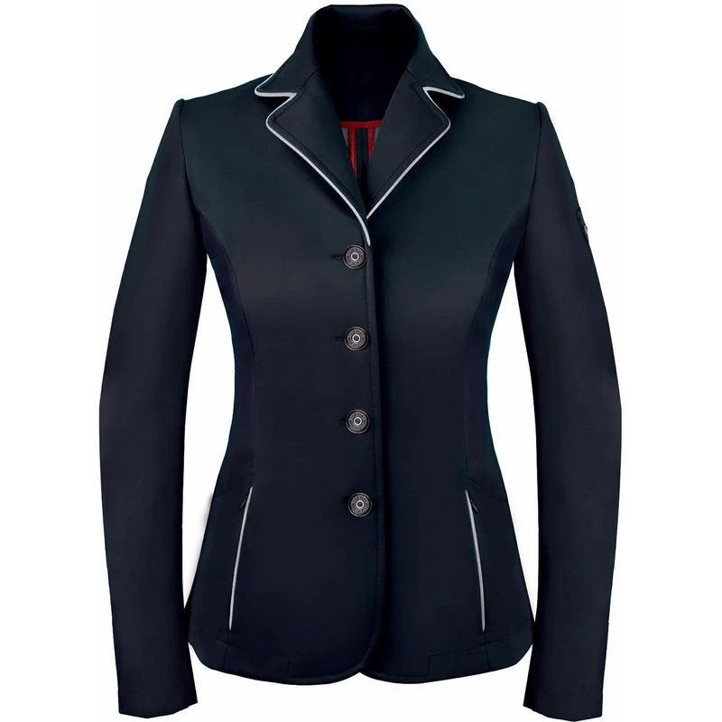 This minimalist, sporty show jacket looks and feels great while you are riding. It has a four button closure and double vents. The two side pockets have concealed zippers. Contrast piping adds a bit of style.