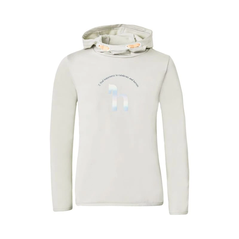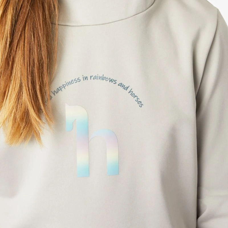 Super comfy hoodie with smooth outer surface to keep horse hair from sticking to it. Additionally, the fabric is breathable and dries quickly. The front features a large holographic ‘h’ logo with ‘I find happiness in horses and rainbows’ above it. Cords in contrast color add a colorful touch, while elastic bindings at hem and cuffs add to the fit and comfort of this hoodie.