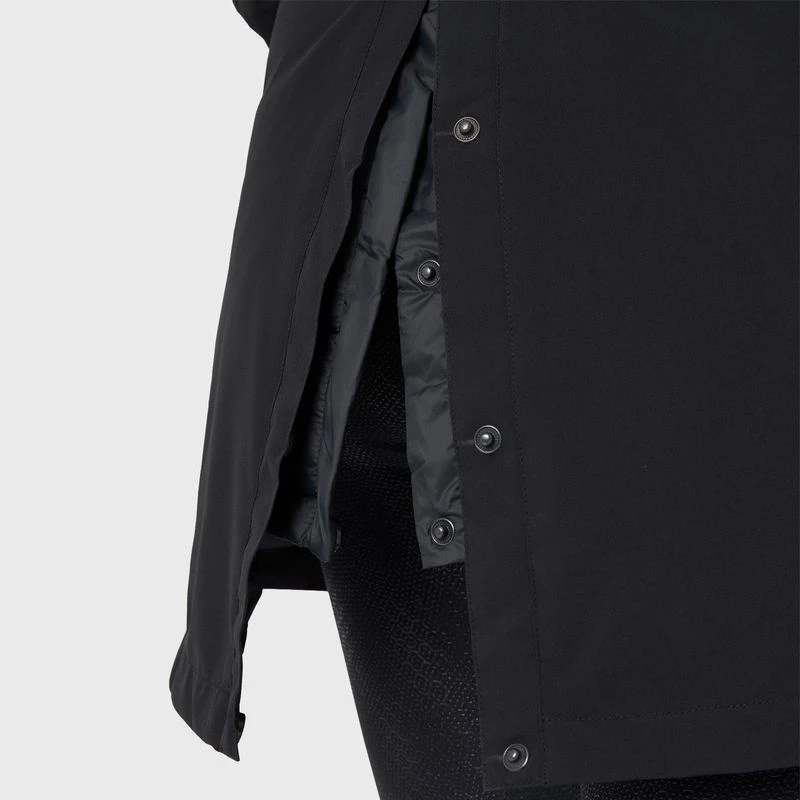 Our Horze Isabella parka jacket is designed as an inner and an outer jacket. Each can be worn separately on days where you need a rain jacket or a padded one. Together they create a warm, water repellent parka. The hood is detachable, and you can adjust the waist for your perfect fit. Two zipper pockets keep your belongings safe. The back slit with press values is comfortable and functional for riding.