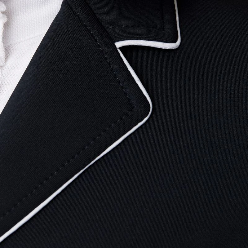 The Horze Martina Show Jacket is the perfect addition to your show turnout. Soft, breathable fabric is elastic to adapt to your movements. The tapered fit flatters your figure. White piping on the lapel adds an eye-catching detail. Front pockets and silver values complete the elegant look. Pair this jacket with your favorite show shirt and breeches.