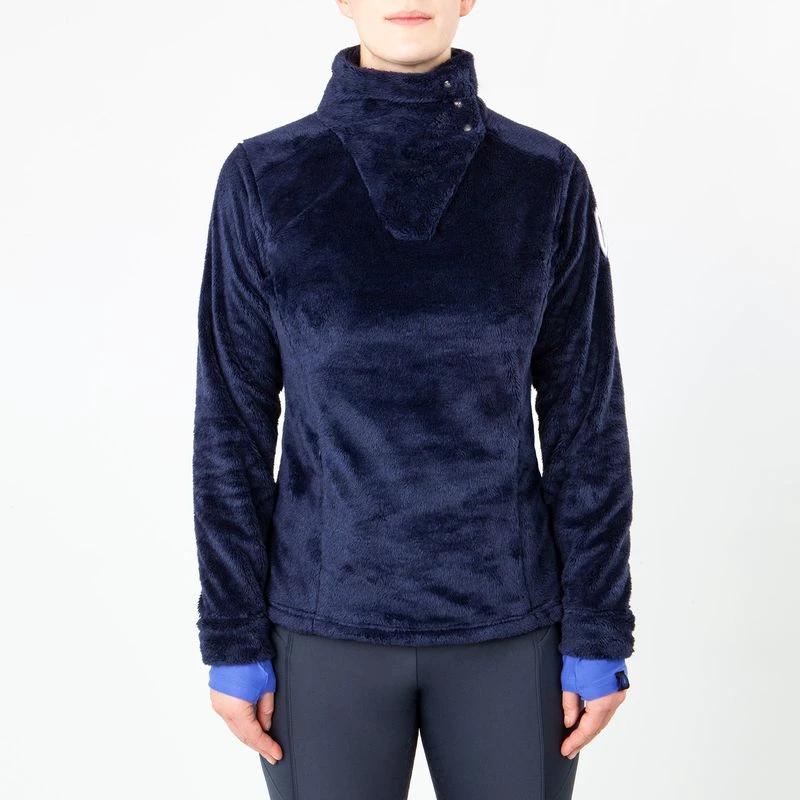 This top is made of soft, cozy two tone Luxen fleece yarns. It has a comfortable snap collar keeps your neck warm, or can be unsnapped for an asymmetrical collar. There are AirTech interior cuffs with thumbholes. Hidden mesh phone pockets inside the kangaroo pocket keeps your phone safe and out of the way. Elliptical hem keeps you covered in the saddle.