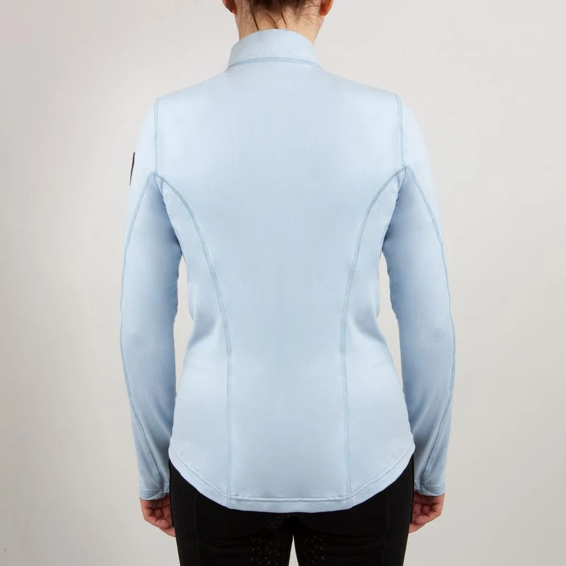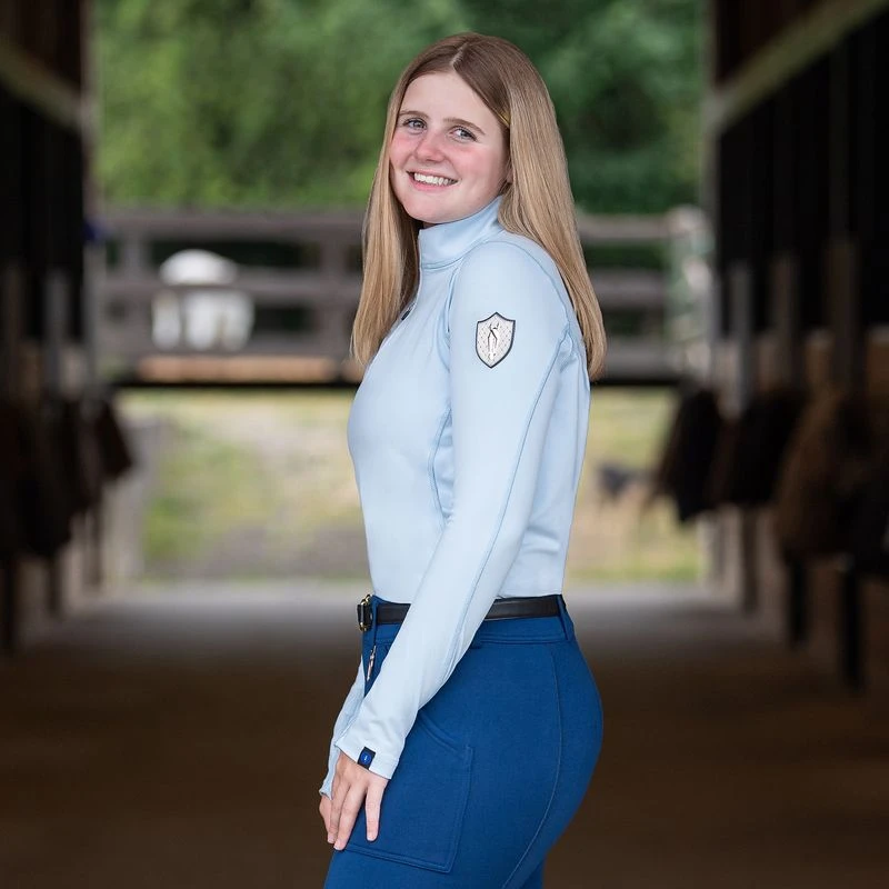 This shirt offers a high collar, inner cuffs with thumbholes, and a beautiful rose gold zipper and horsehead crest on the sleeve that adds a stylish touch.