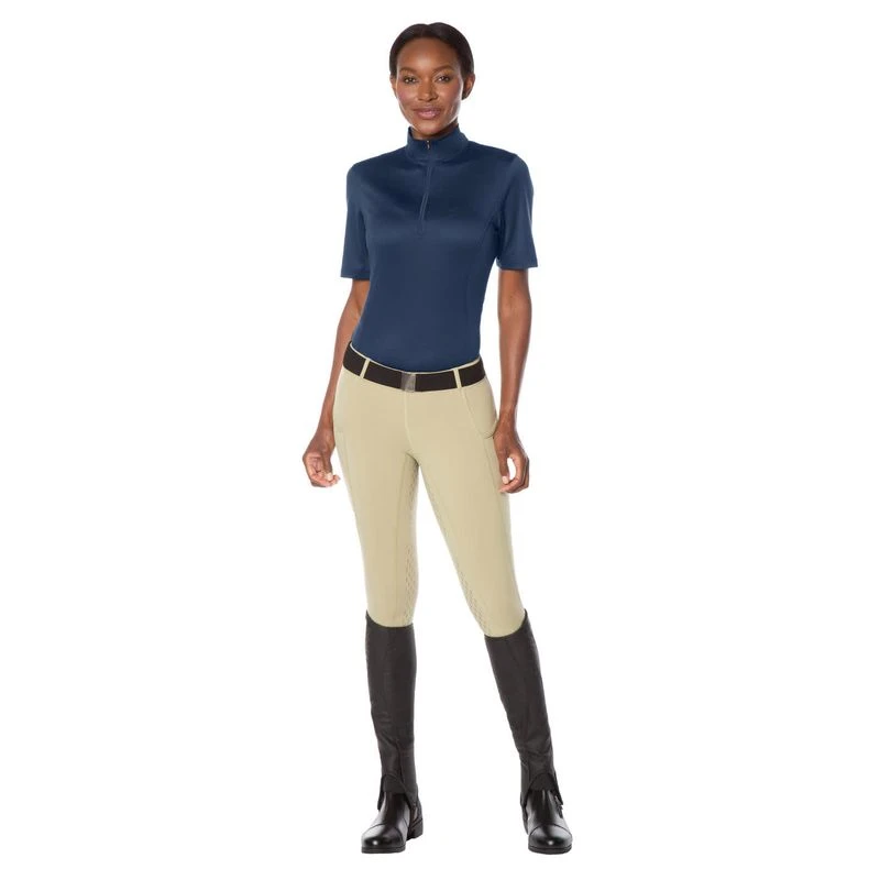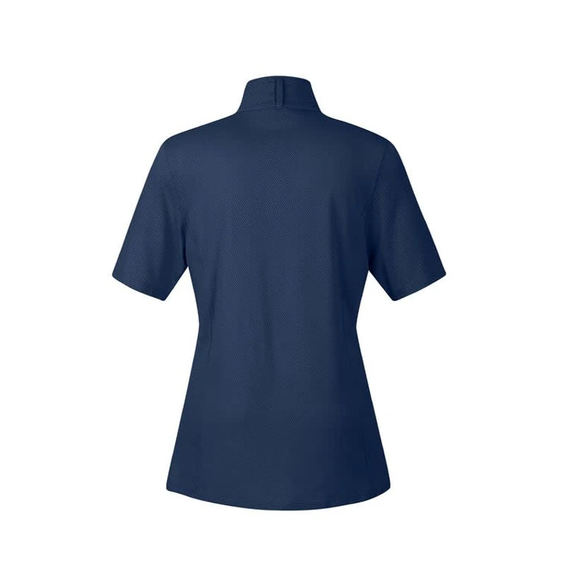 The sporty, feminine fit, and equestrian hem flatter for everyday wear, while the stock tie loop and stand-up collar add sophistication for the showring. Longer ten-inch sleeve length for added sun protection. Minimal seaming makes this shirt ideal for logo customization.