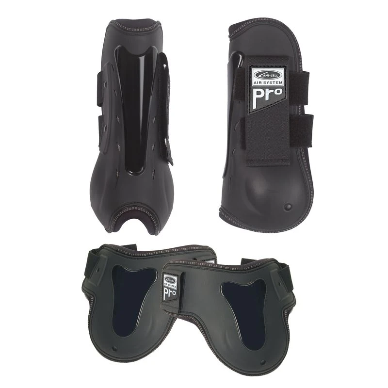 These molded open-front tendon boots and Fetlock Boots feature a tough outer shell that protects against strike and knock injuries. They feature high-tech perforated foam padding with air vents around the strike pads, reducing sweat build-up and keeping the leg cool. Elasticized lock straps for added security, and soft neoprene lining for added comfort., Set includes a pair of Tendon Boots and a pair of Fetlock Boots.