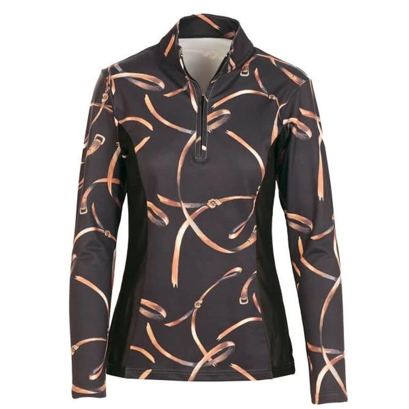 This breathable, stretchy shirt is made of a silky soft performance knit fabric with a smooth exterior that sheds hay, horsehair and dirt. It is moisture wicking for all day comfort, and the sheer mesh under the arms provides ventilation and cooling.