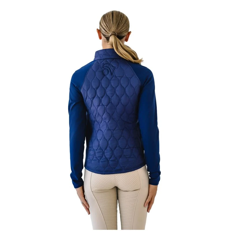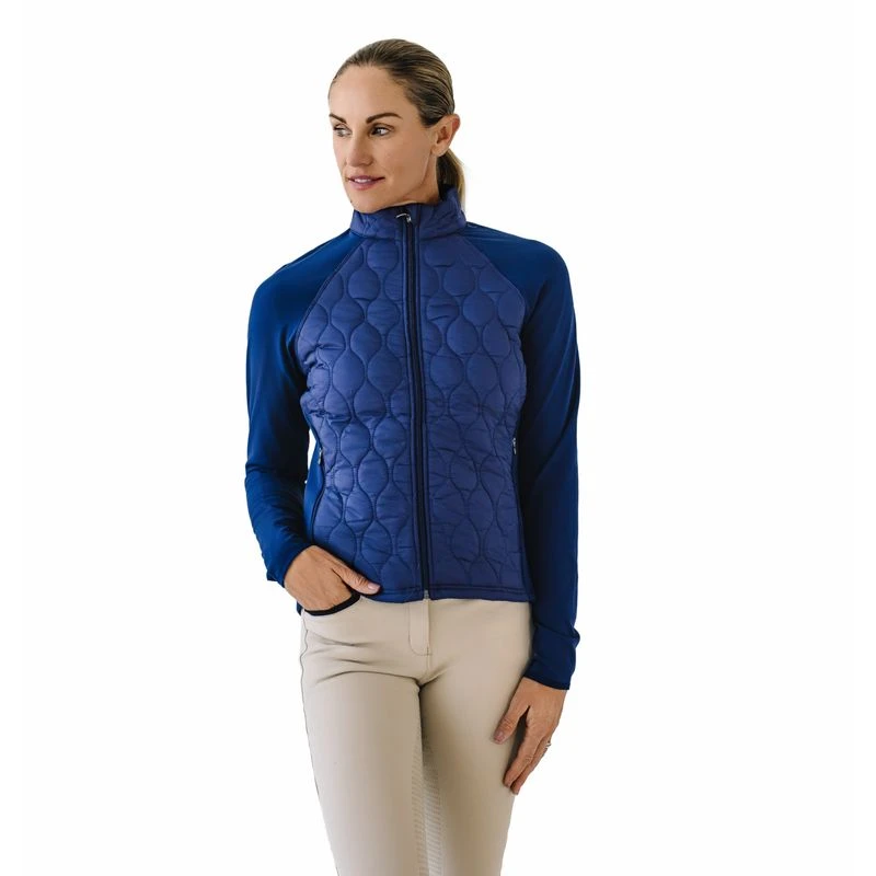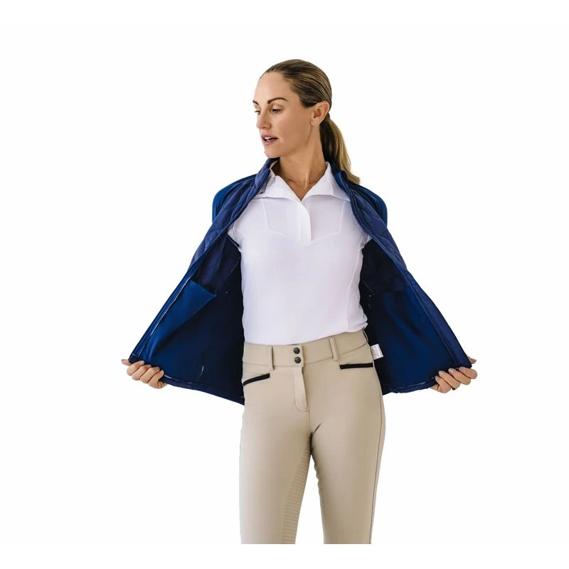 This multi-season jacket features a quilted front and back. The sleeves and side panels are stretch tech fabric to insure freedom of movement. The collar is an equestrian style tab collar, and the curved back hem provides coverage in the saddle.