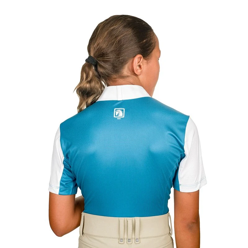 This show shirt features short sleeves and a woven front white placket. It will always look formal under a show coat with only white showing. Made of 100% polyester interlock with 50+ UV protection, it doesn’t just look good, it feels good to ride in. An added plus, the fabric is water repellent which means it will stay cleaner, no matter what your pony slobbers on it! On a hot day, just take off the coat, open the wrap collar and COOL OFF!