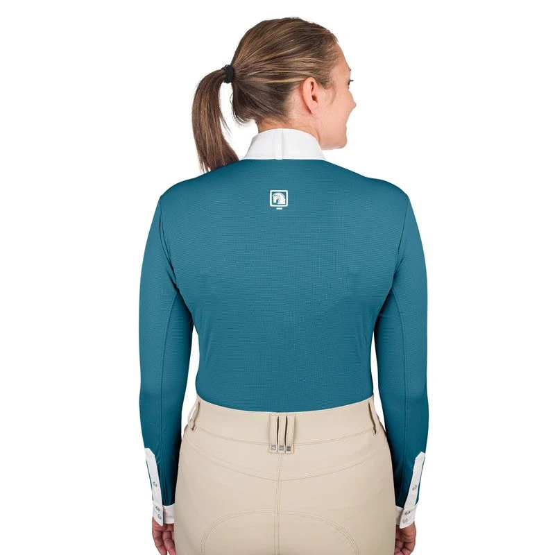 This 1/4 neck, tab collar show shirt is appropriate for virtually any English discipline. It is made of 100% polyester interlock fabric that is comfortable, breathable and moisture wicking, as well as being 50+ UV protective. The surface of the shirt is water repellent, which means it is very difficult to stain. No more green smears right before going into the ring! The covered zipper placket makes for a smooth line under your coat, and the three snap collar opens up when you are not in the ring. It has a woven collar, placket and cuff detail.
