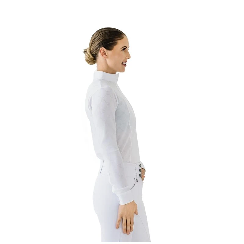 This 1/4 neck, tab collar show shirt is appropriate for virtually any English discipline. It is made of 100% polyester interlock fabric that is comfortable, breathable and moisture wicking, as well as being 50+ UV protective. The surface of the shirt is water repellent, which means it is very difficult to stain. No more green smears right before going into the ring! The covered zipper placket makes for a smooth line under your coat, and the three snap collar opens up when you are not in the ring. It has a woven collar, placket and cuff detail.