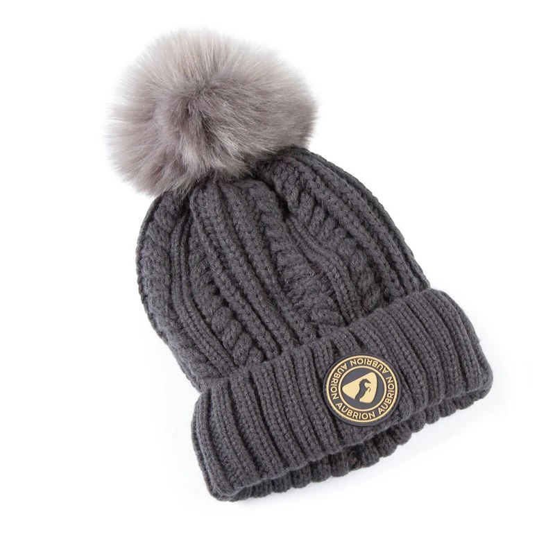 This cable knit winter hit features a deep turned up brim with Aubrion badge and a super fluffy faux pom pom.