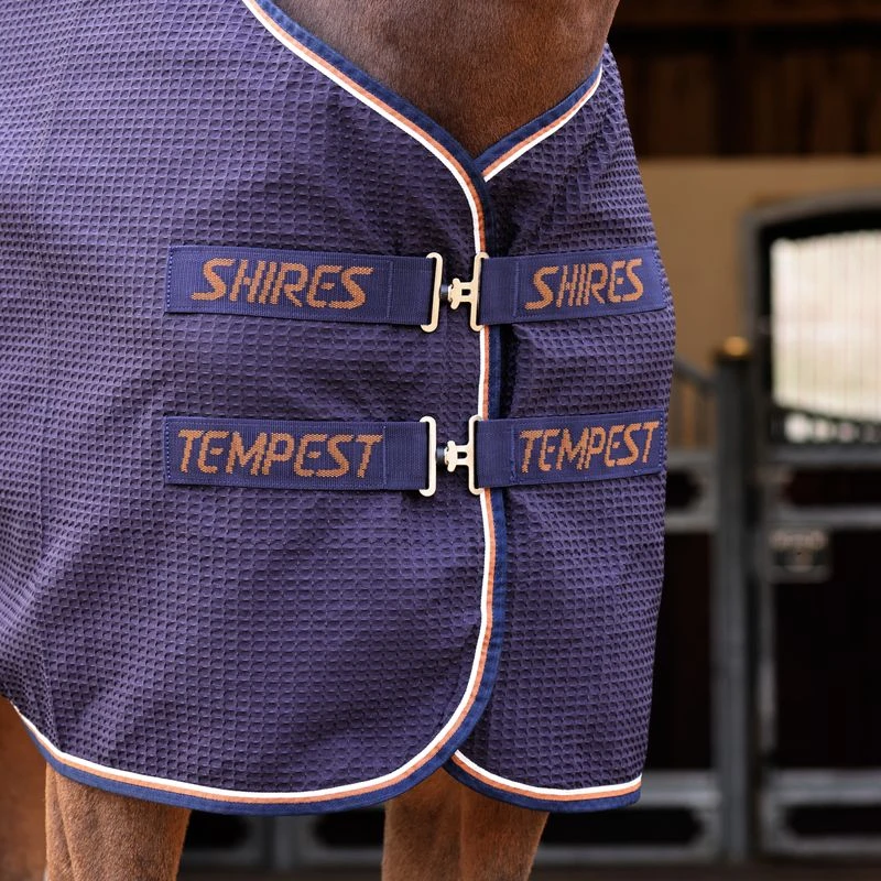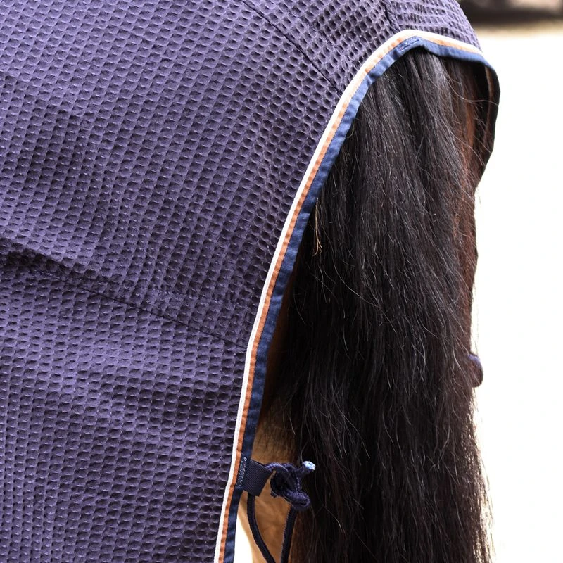 Polyester waffle material dries quickly and keeps its shape. Lightweight and durable, this waffle rug is highly moisture wicking and creates a micro-climate to prevent chilling. This body temperature regulating rug features double chest straps, adjustable cross surcingles, and a tail strap. Machine washable.