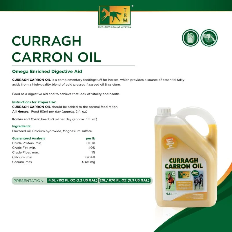 CURRAGH CARRON OIL should be added to the normal feed ration. All Horses: Feed 60ml per day (approx. 2 fl. oz). Ponies and Foals: Feed 30ml per day (approx. 1 fl. oz).
