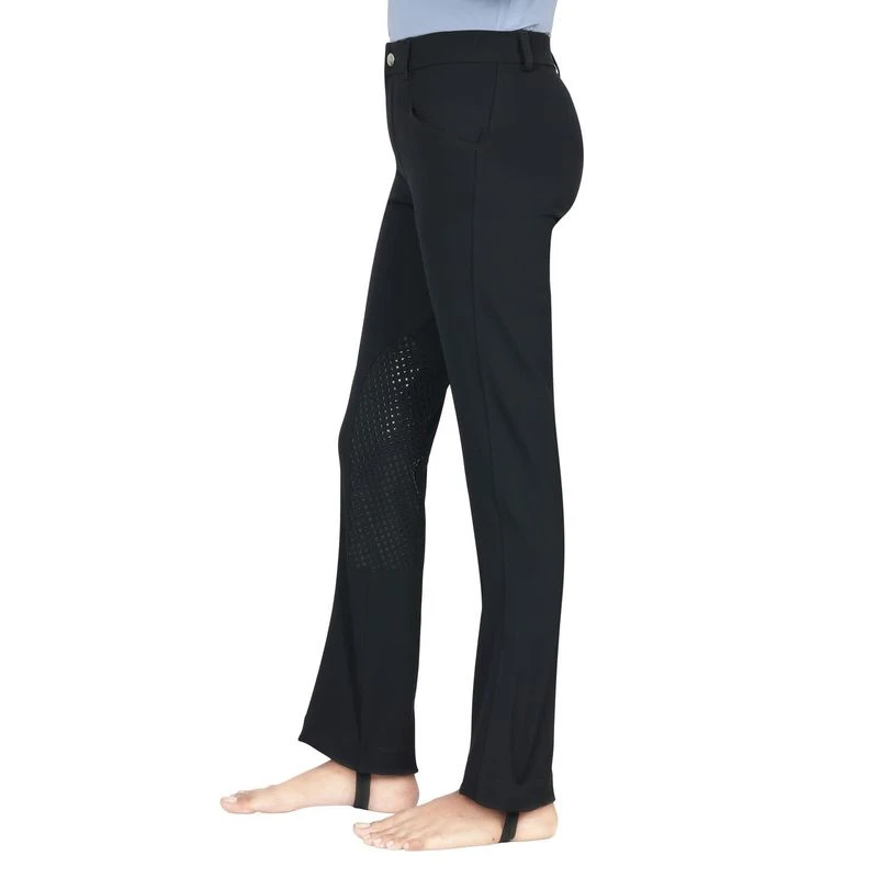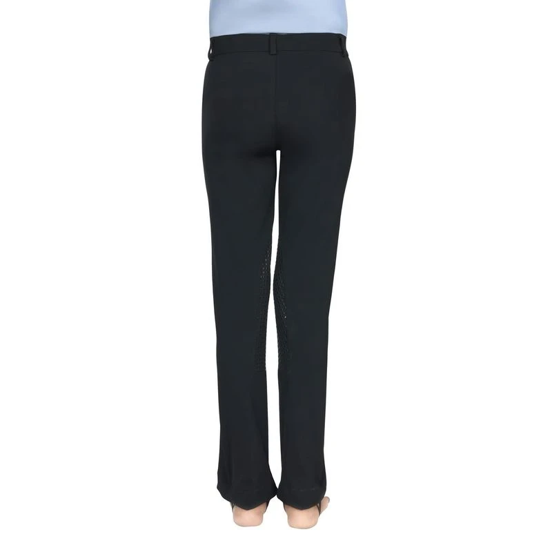 The TuffRider Kids Front Zip Silicone Knee Patch Kentucky Jods are made from a stretchable blend of 92% nylon and 8% spandex, providing flexibility and a great fit. The valuehole elastic straps at the bottom, with adjustable values, ensure they stay in place, while the silicone knee patches offer added grip and security in the saddle. Flared at the bottom and long, these jods are designed to fall below the level of the foot when mounted, rather than being tightly cuffed. Complete with two front pockets and a classic equestrian look, they combine practicality with style.