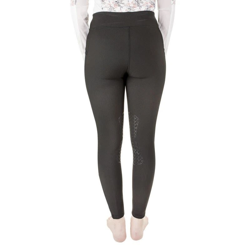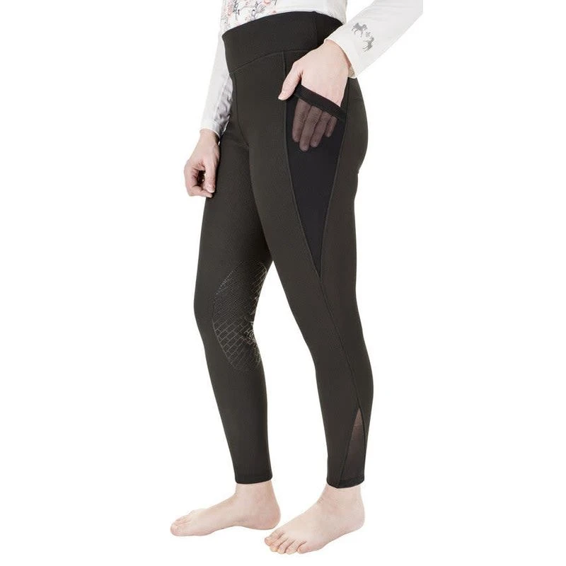 Designed with a wide waist band that offers a slimming effect for a flattering shape. Other features include a mesh pocket that’s convenient for small items like a hair tie or treats. A mesh contoured lower leg that eliminates bulk in your boot and offers extra ventilation during the summer months to keep you cool in the saddle.