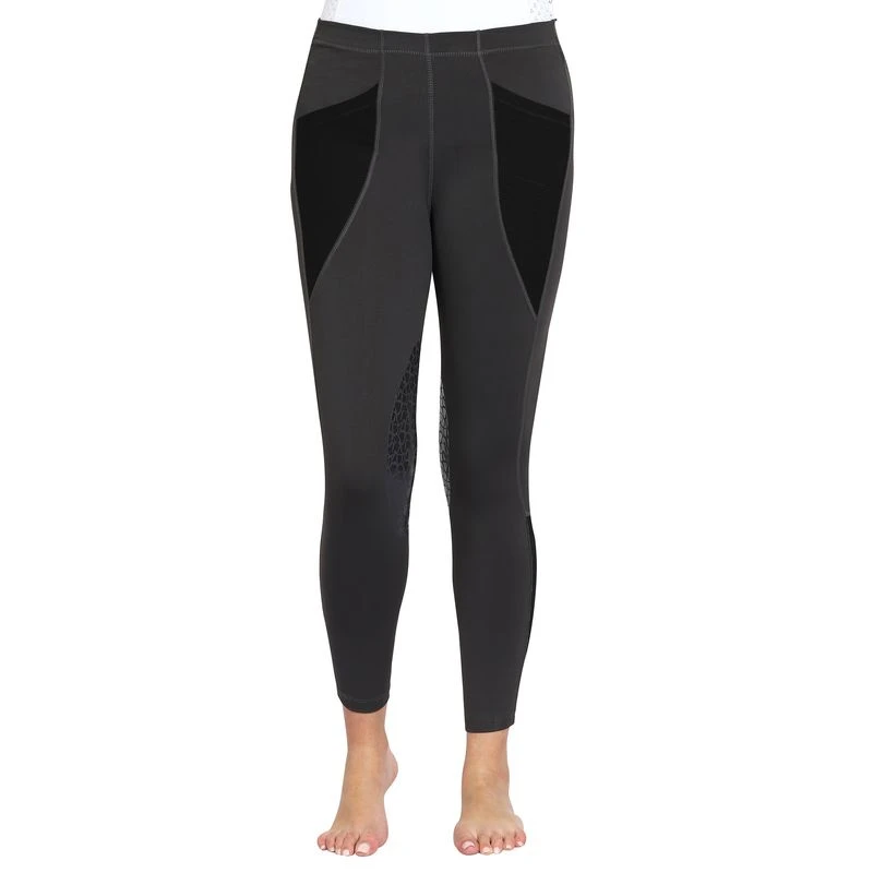 The Tatum Tights will feel like your favorite pair of yoga leggings. Features such as crackle silicone knee patches for friction and extended mesh bottoms are functional details offered on the Tatum Tights. Vented pockets are convenient to hold small items and your smartphone while tacking up and barn work.